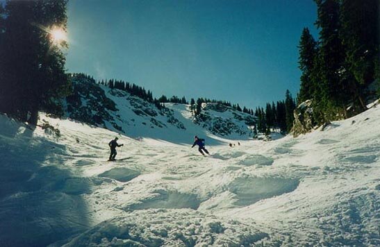 | Unlike the ridge terrain at Taos, it takes only a short two minute hike to reach this run, Hunziker Bowl. The short uphill hike intimidates many skiers (one normally skis to go downhill) so we found some of the freshest snow on the mountain here each day. Worth the two minutes! |